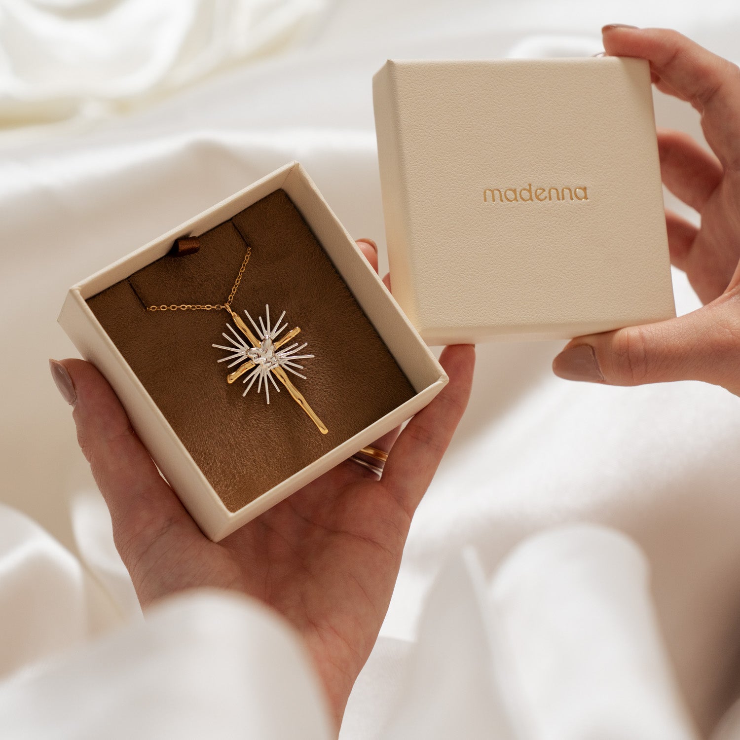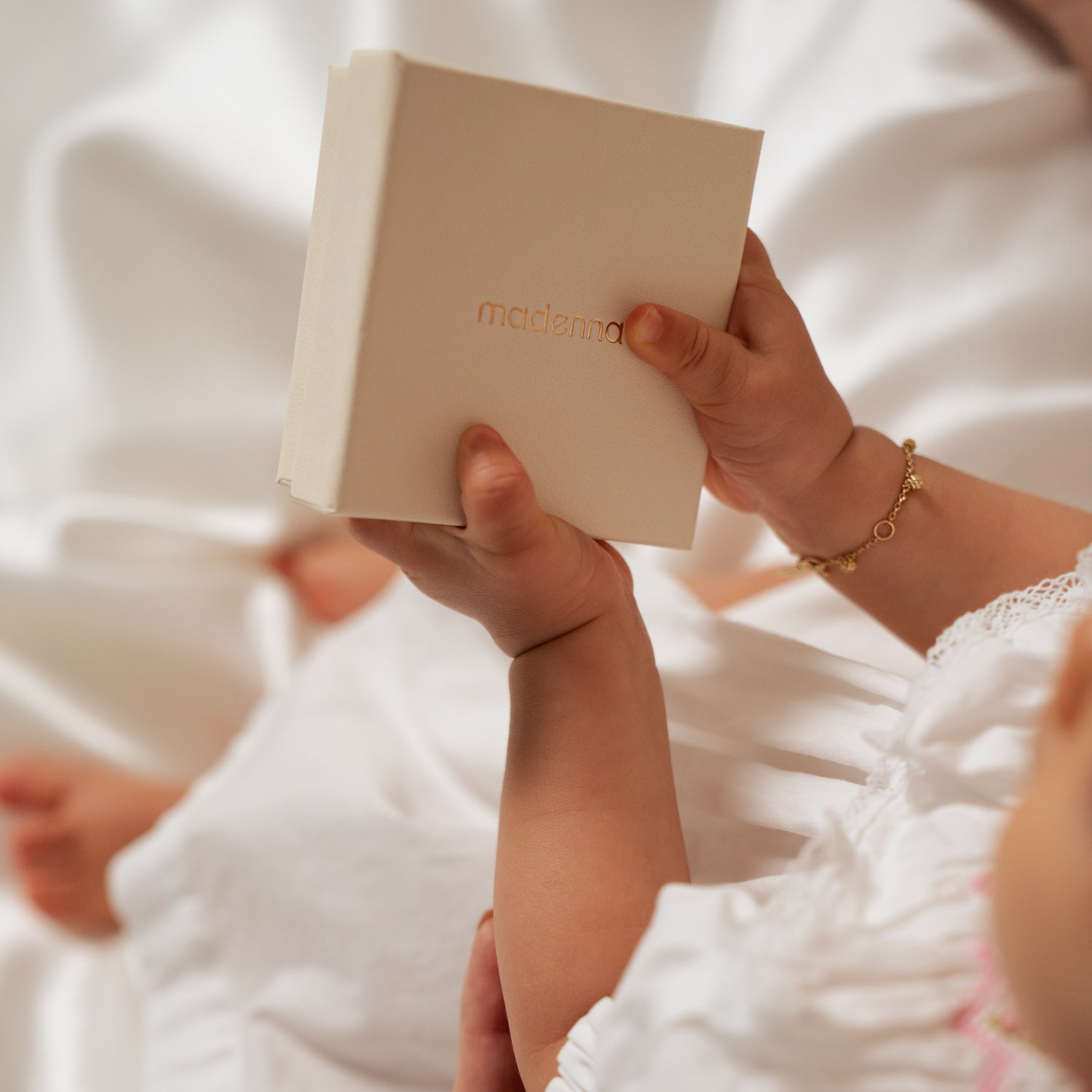 A Caixa Presente Madenna é personalizada com o nome da marca em dourado e traz acabamento sofisticado por dentro e por fora. Revestida internamente com camurça, conserva suas joias com delicadeza e elegância.