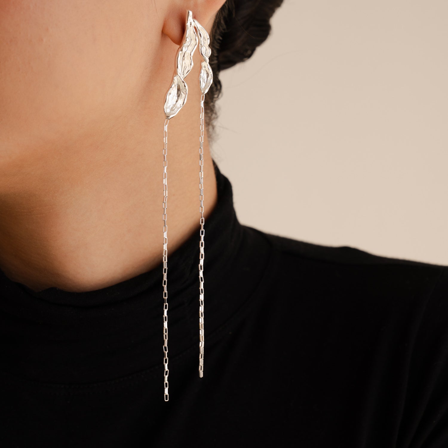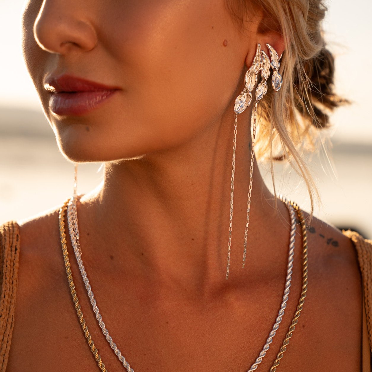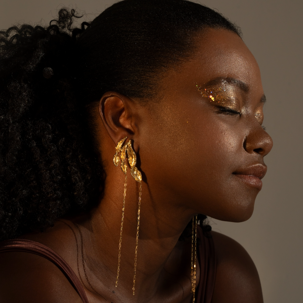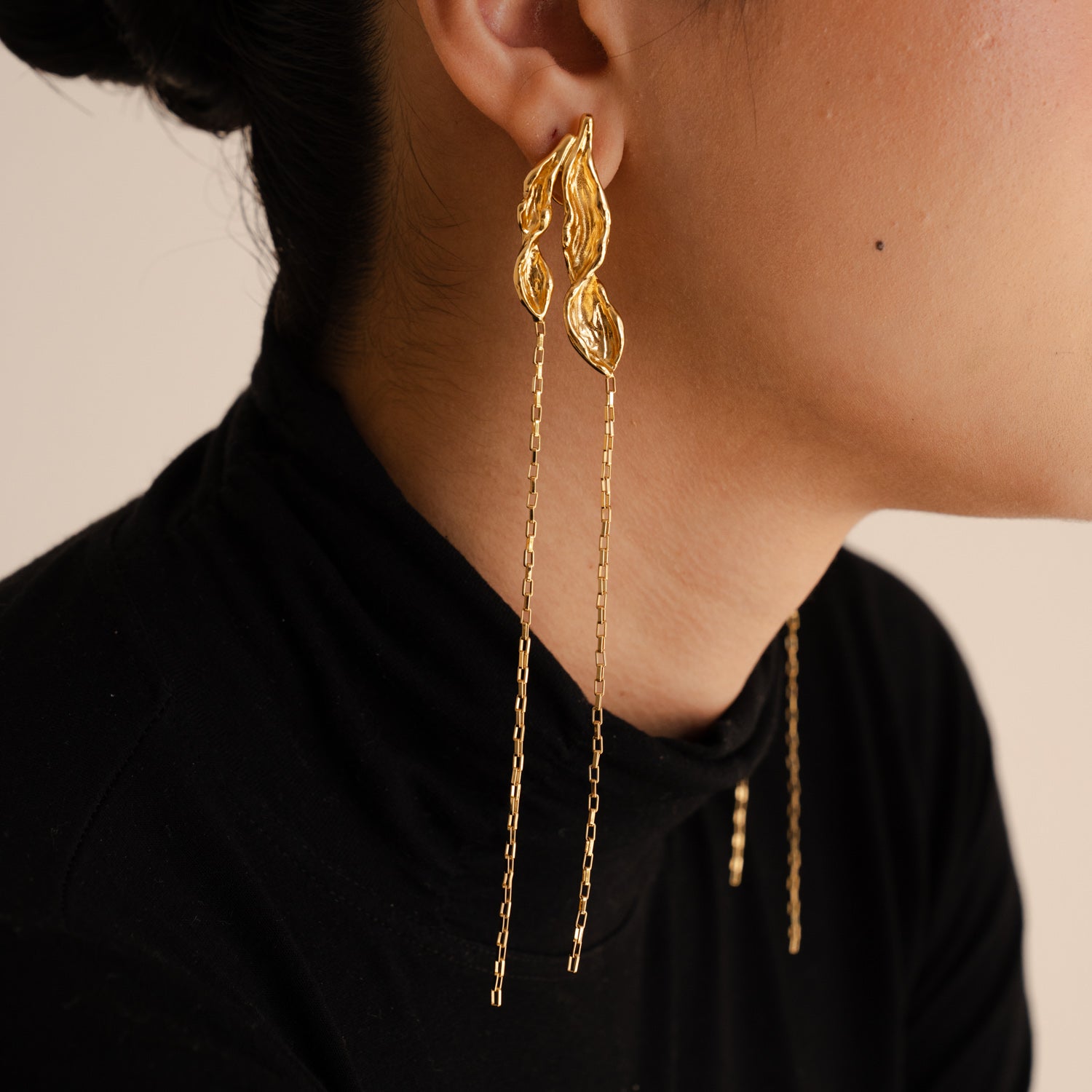 Brinco inspirado no raio de sol. Possui duas correntes como franjas.