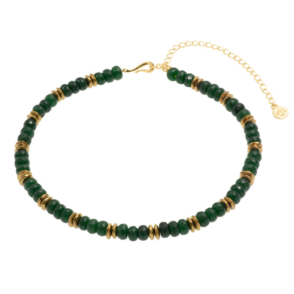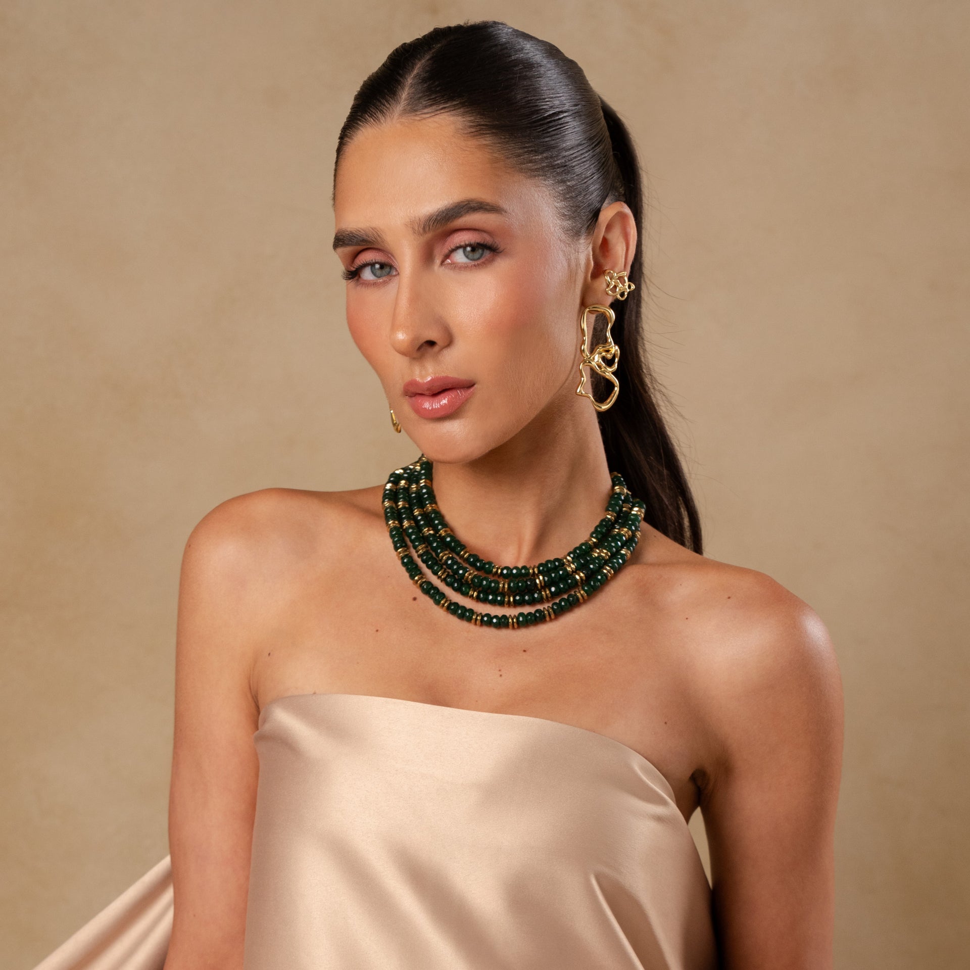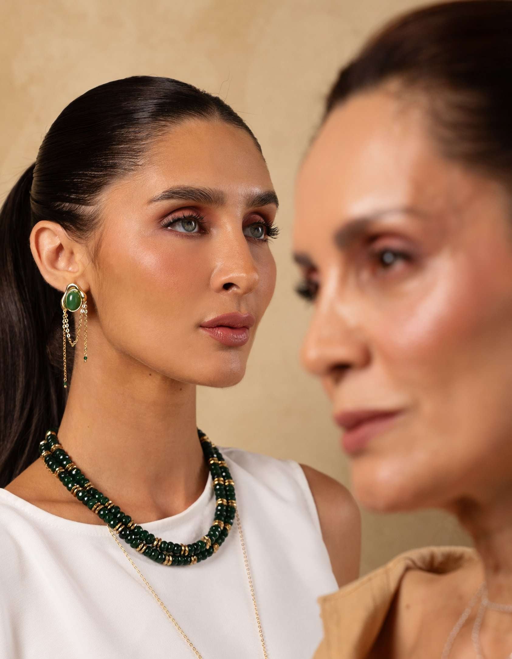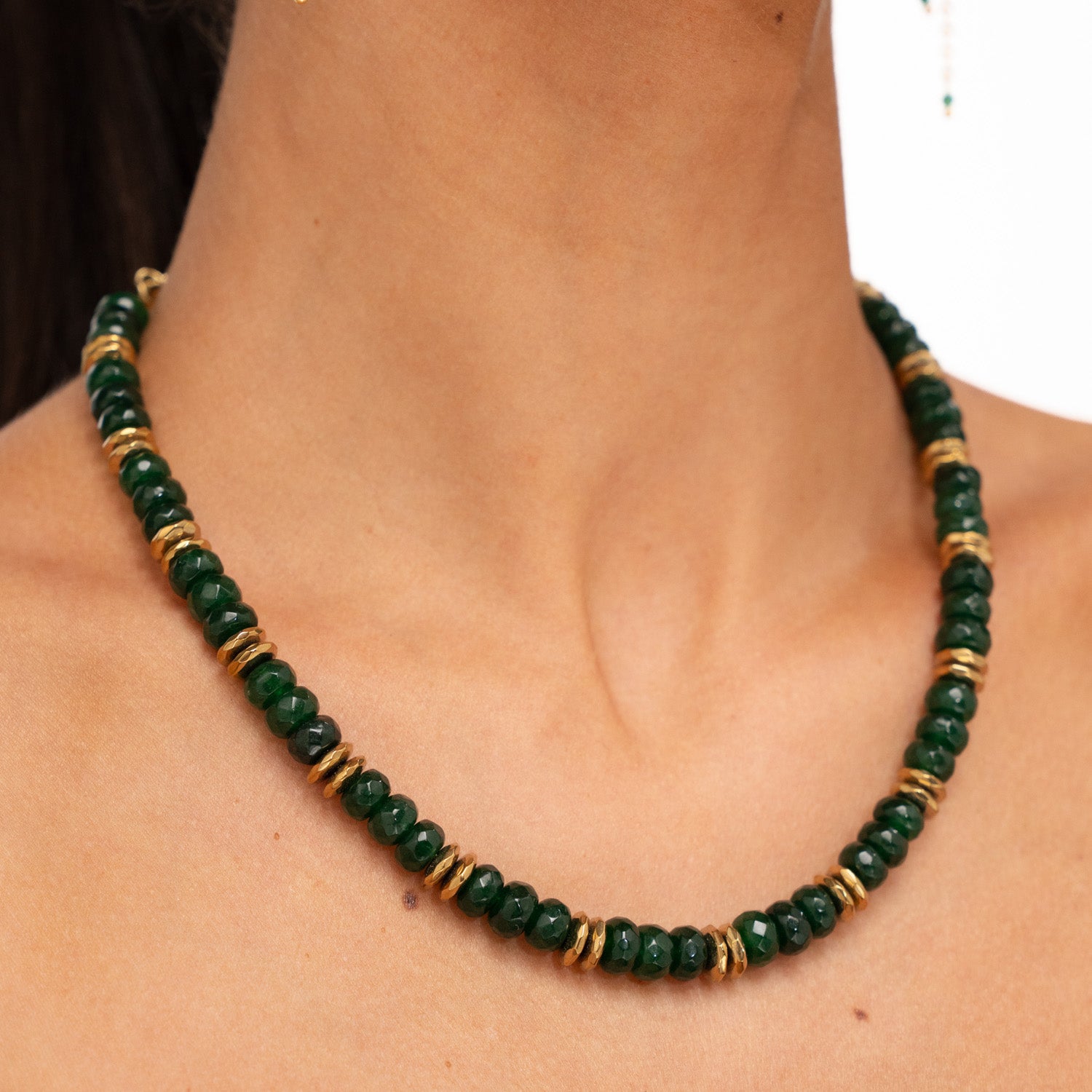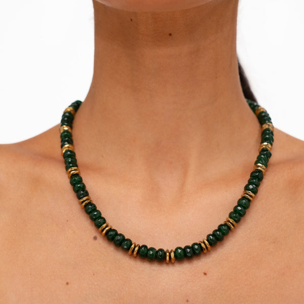O Colar Face é uma joia curta e sofisticada, criada com pedras jade verde facetadas, que refletem a luz com intensidade e elegância. Intercalado com hematitas banhadas, traz contraste e modernidade à peça.