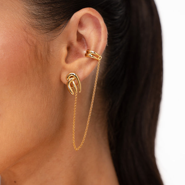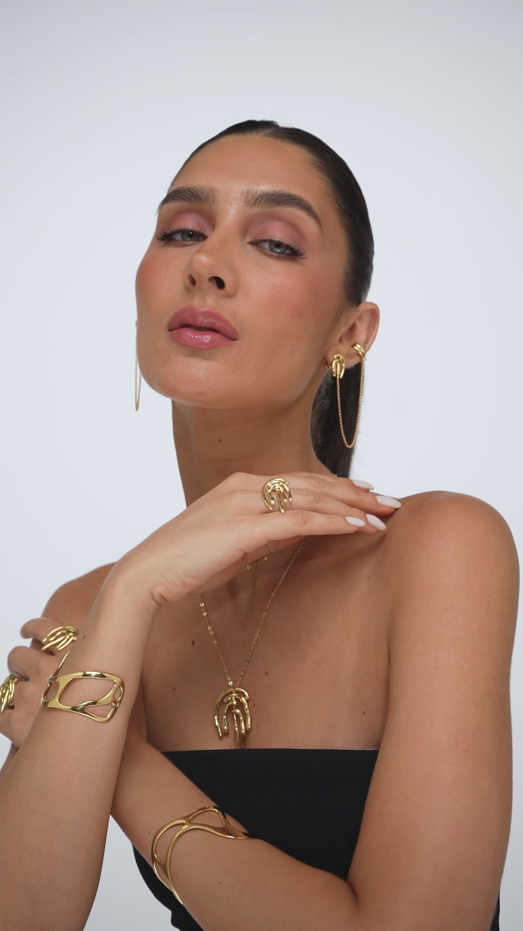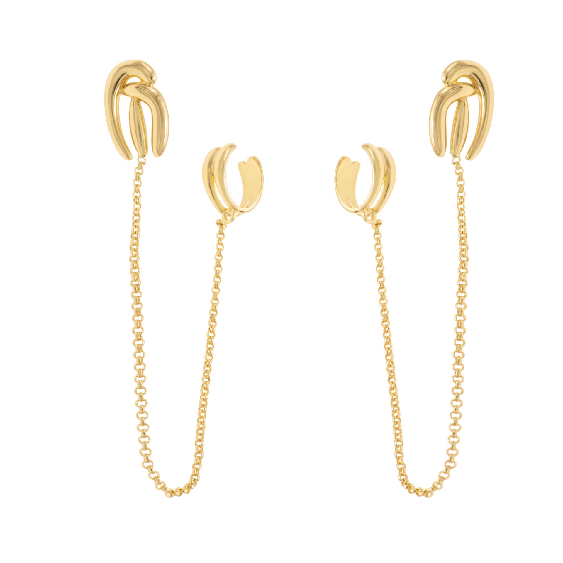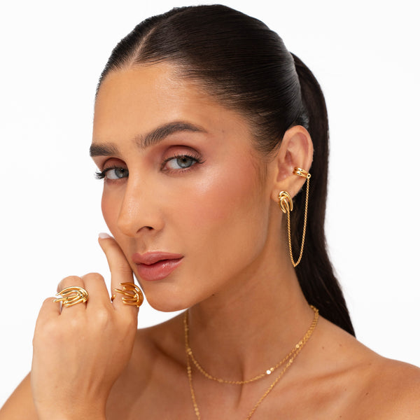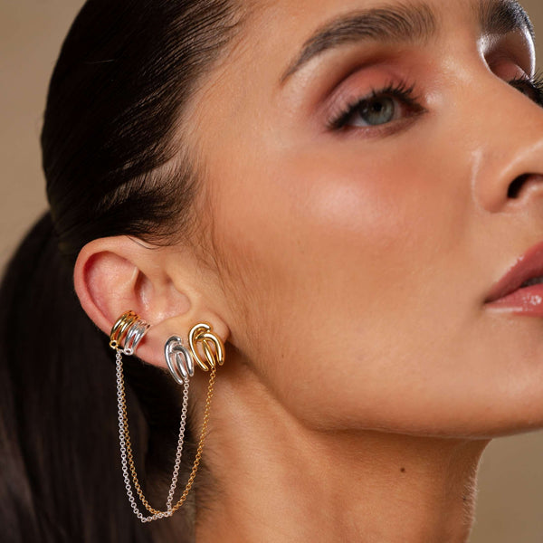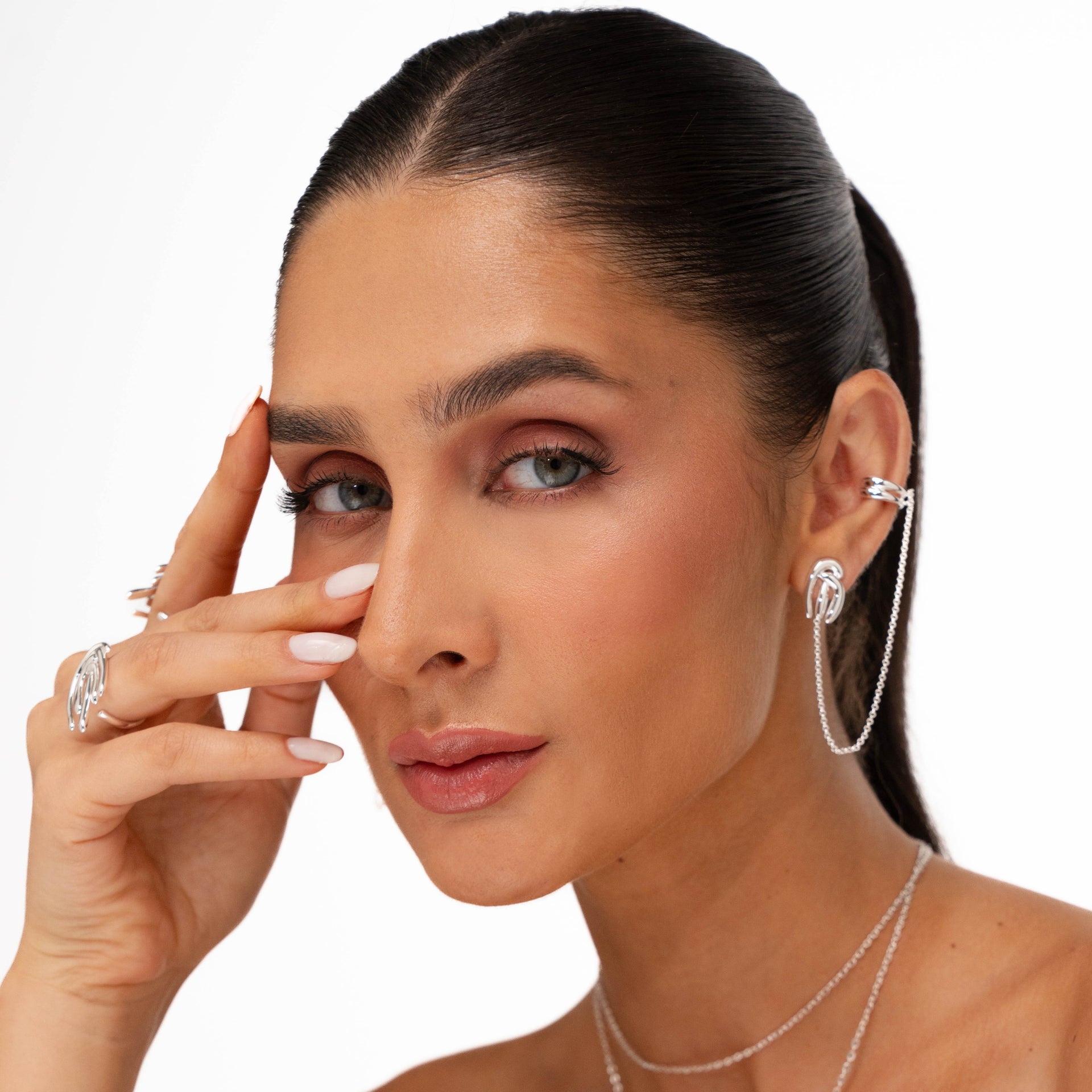 O Ear Cuff Pele é a tradução perfeita da delicadeza que também carrega força. Seu design duplo, conectado por correntes leves, cria movimento e fluidez, como linhas que a vida desenha em nossa pele.
