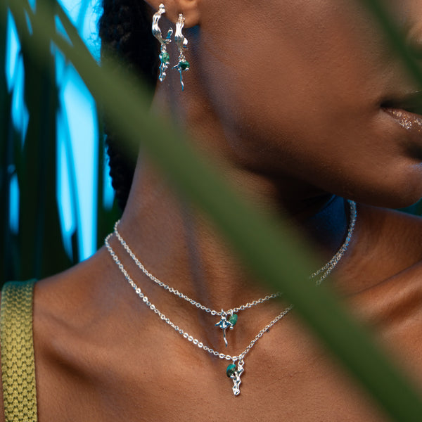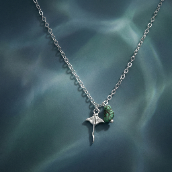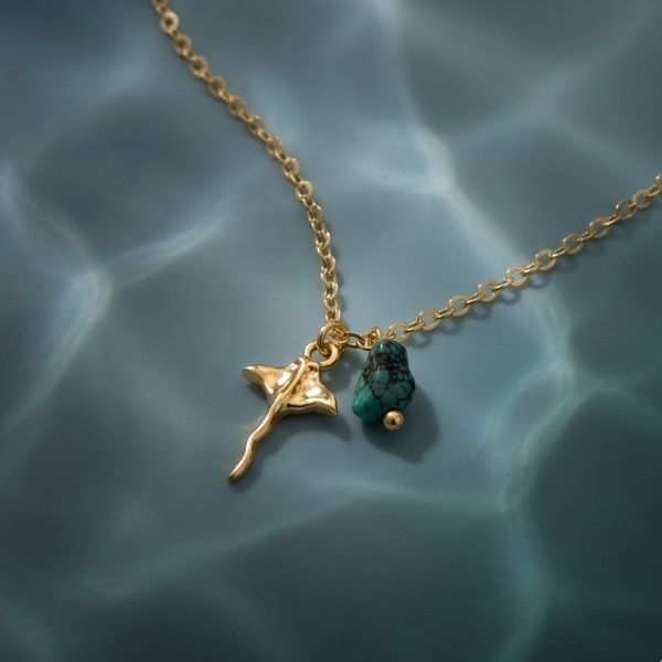 O Colar Arraia traz toda a delicadeza e liberdade das arraias que deslizam pelo fundo do mar, agora em uma versão leve, moderna e perfeita para uso diário. O pingente escultural, o mesmo da Argola Arraia, ganha ainda mais destaque ao lado da turquesa natural, que adiciona cor, frescor e a energia tranquila das águas profundas.